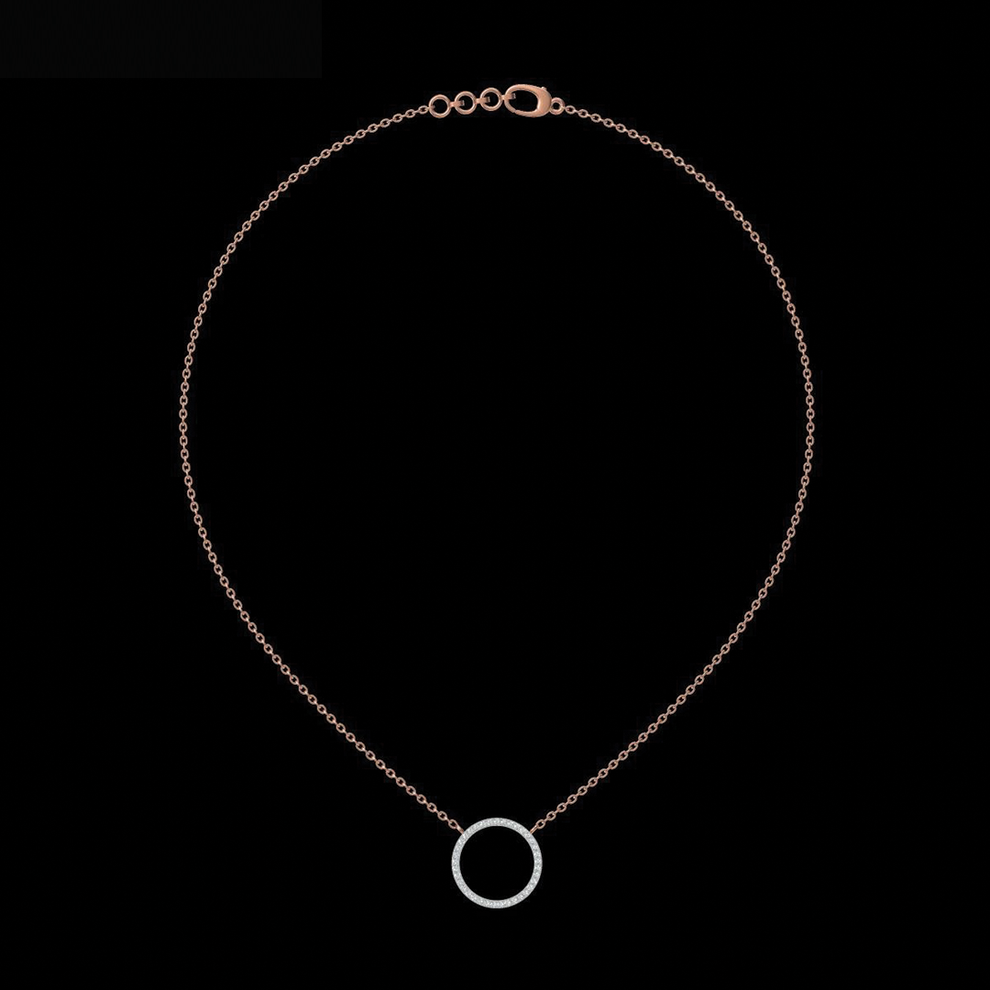 Crafted in 9K rose gold, this delicate necklace features a diamond-studded open circle pendant — a symbol of continuity, balance, and endless elegance. The minimal silhouette allows the brilliance of finely set diamonds to shine subtly, making it perfect for everyday wear and effortless layering.