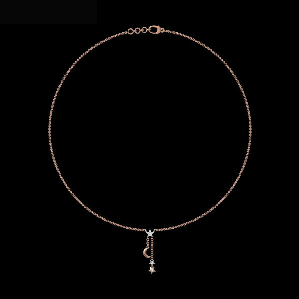 The Nimiraa Chandra Sutra Necklace is a gentle expression of celestial elegance. Crafted on a fine rose-gold chain, it features a graceful drop adorned with a crescent moon and star motifs — subtle symbols of guidance, calm, and inner glow.