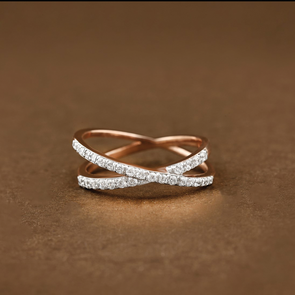 Minimal yet mesmerizing, this design celebrates the beauty of precision. Crafted in 9K rose gold, two diamond-lined bands cross effortlessly, forming a soft criss-cross silhouette that feels light, fluid, and modern.